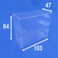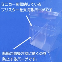 下段に収納した紙箱が前後に移動しない様にするためと、上段に収納したブリスターが下に落ちない様にするための2つのストッパーを備えているので、安定した状態で展示を行う事のできるクリアケースです。